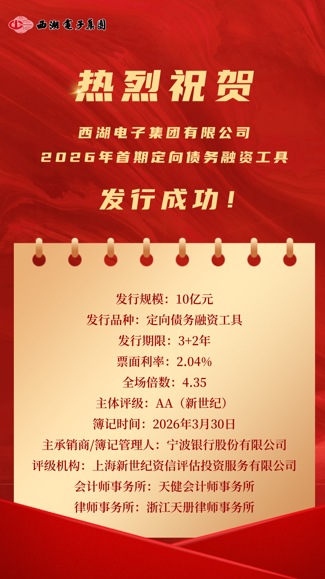 奋战一季度|西湖电子集团成功发行2026年首期定向债务融资工具